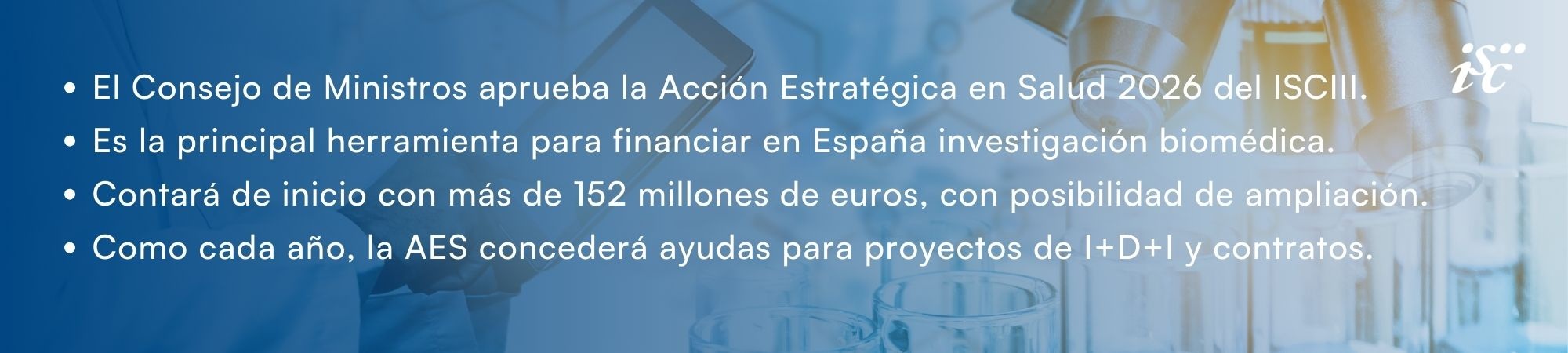 Como cada año, el ISCIII llevará a cabo una jornada informativa sobre la AES 2026, abierta a toda la comunidad investigadora, para explicar y exponer la AES 2026, sus novedades, su desarrollo y cómo concurrir a las ayudas.