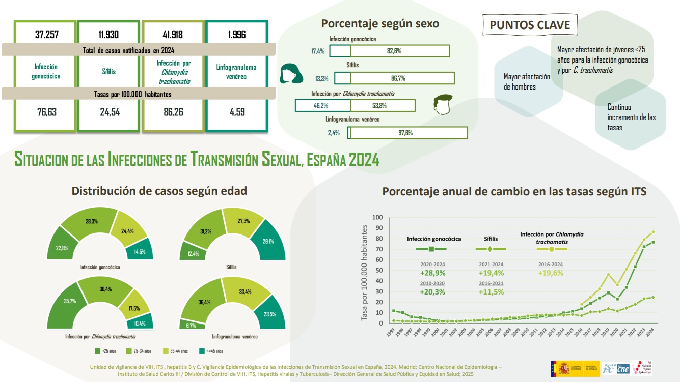 El informe está publicado por el Instituto de Salud Carlos III (ISCIII) a través de su Centro Nacional de Epidemiología (CNE), en coordinación con el Ministerio de Sanidad. Sus resultados confirman también más infecciones en hombres que en mujeres, y mayor afectación en personas menores de 25 años, especialmente en la infección gonocócica y por clamidia.