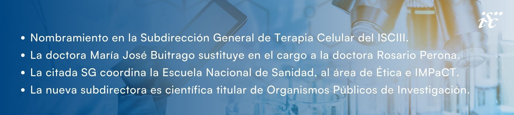 El Instituto de Salud Carlos III (ISCIII) ha nombrado a la doctora María José Buitrago Serna subdirectora general de Terapia Celular y Medicina Regenerativa, en sustitución de la doctora Rosario Perona. Licenciada y doctorada en Biología por la Universidad de Salamanca y científica titular de Organismos Públicos de Investigación desde 2006, la nueva subdirectora ocupaba desde 2022 el cargo de Coordinadora de Programa de la Subdirección General de Servicios Aplicados Formación e Investigación.