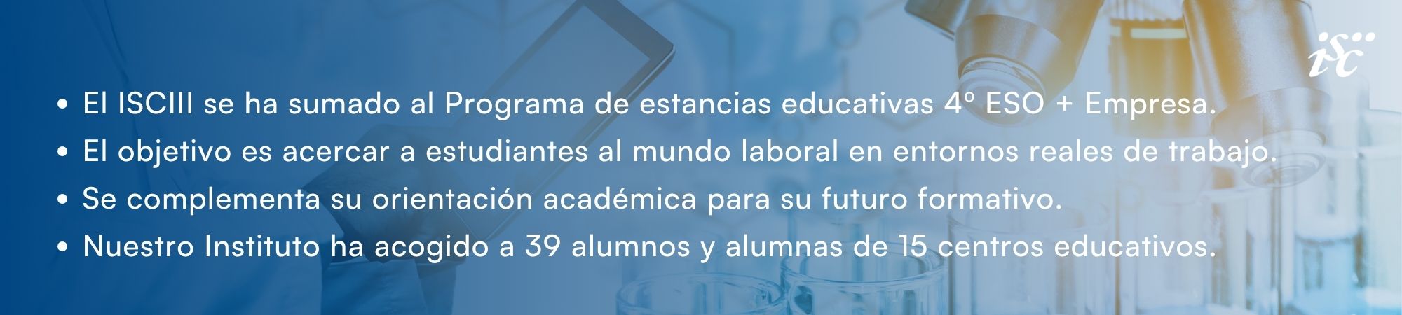 El Instituto de Salud Carlos III (ISCIII) ha participado en el Programa 4º ESO + Empresa, una iniciativa de la Comunidad de Madrid que permite que estudiantes de 4º curso de Educación Secundaria Obligatoria (ESO) realicen estancias educativas de varios días en empresas y organismos públicos.
